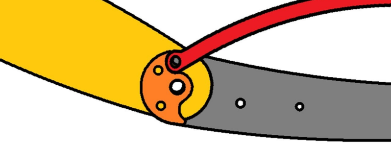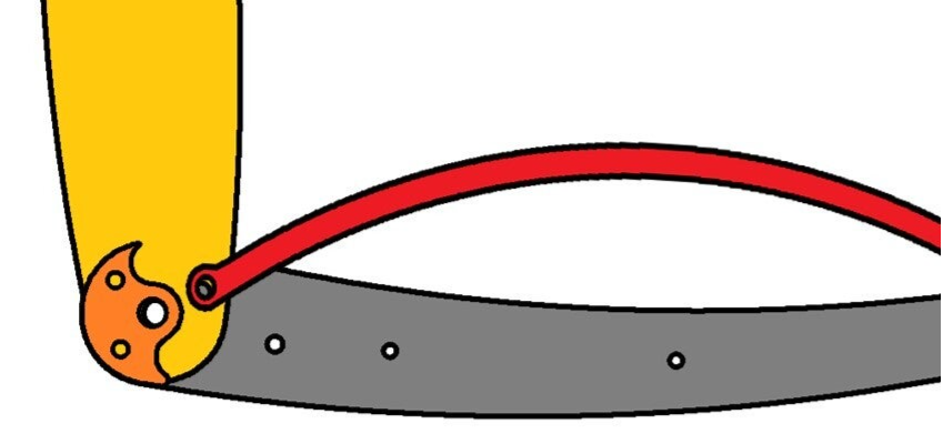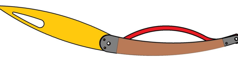 De externe veer (rood) duwt het mes in de uitsparingen van de 'bumper' (oranje). Hierdoor wordt het mes in zowel ingevouwen als uitgevouwen toestand 'gelocked'. Het is geen vergrendelende lock maar net als de slipjoint, bekend van vele zakmessen zoals Laguiol, verend. Hierdoor is het een legaal te dragen zakmes.