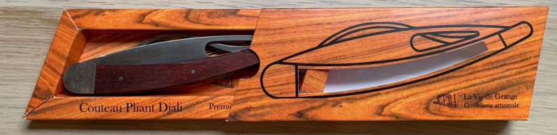 Het Djali zakmes is niet perse handig, het is vooral ontworpen naar vorm en schoonheid. Waar het mes en het handvat dezelfde radius volgen zijn de overige rondingen daarop afgestemd. Het mes en de veer zijn gemaakt van 420c staal, de liners (binnenplaten) van 'gewoon' roestvast staal en het handvat van gestabiliseerd hout. De dikte van het hout is dusdanig dun (2mm) dat stabiliseren een vereiste is. Bij deze behandeling wordt het hout gedroogd, ondergedompeld in een epoxyvloeistof en onder vacuum wordt zoveel mogelijk lucht uit het hout gezogen. Zoda het vacuum wordt opgeheven dringt de vloeistof diep in het hout en na het uitharden is dit hout veel harder, sterker en waterbestendiger.